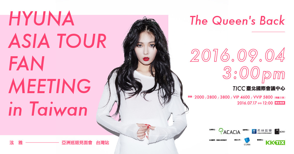 韓國性感女神泫雅將於9/4 在TICC舉辦HYUNA Asia Tour Fan Meeting in Taiwan -The Queen's Back-,睽違三年再度造訪台灣,海外首場的見面會兼showcase將會獻給台粉,現場將會演唱多首膾炙人口代表泫雅的成名曲,想要親眼一睹泫雅的舞台魅力,千萬要把握這次的機會!